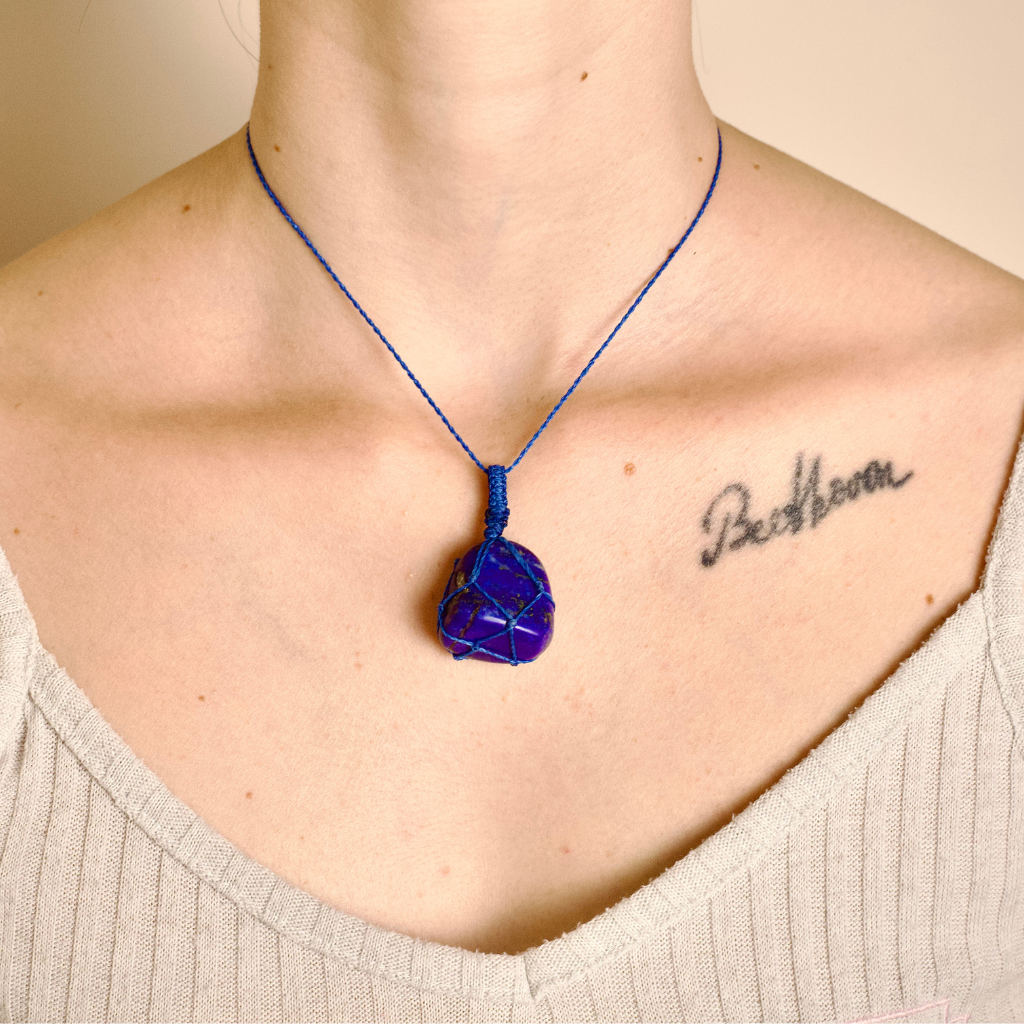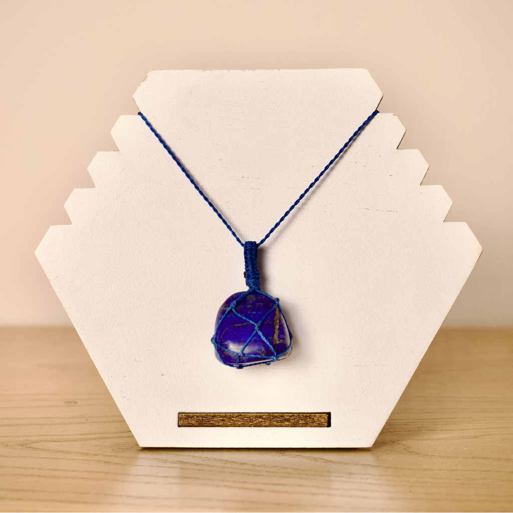 Conecta con la energía profunda del Lapislázuli, una piedra asociada a la sabiduría, la claridad mental y la comunicación auténtica. Este colgante artesanal está tejido a mano en macramé, convirtiéndose en una pieza única que te acompaña en tu crecimiento personal y espiritual.
