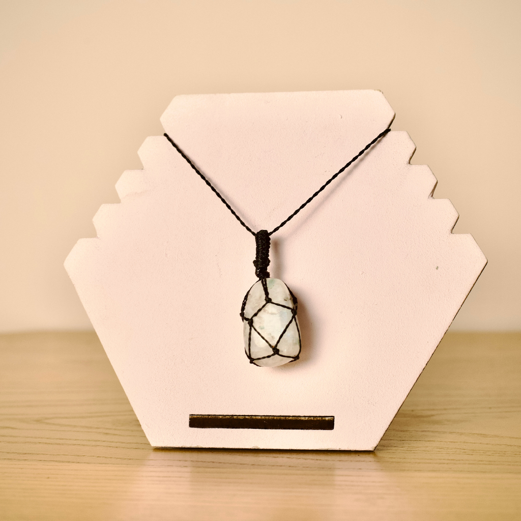 Conecta con la energía suave y mágica de la Piedra Luna, una gema asociada a la intuición, la armonía y los ciclos naturales. Este colgante artesanal está tejido a mano en macramé, creando una pieza única para acompañarte en tu día a día con serenidad y conexión interior.