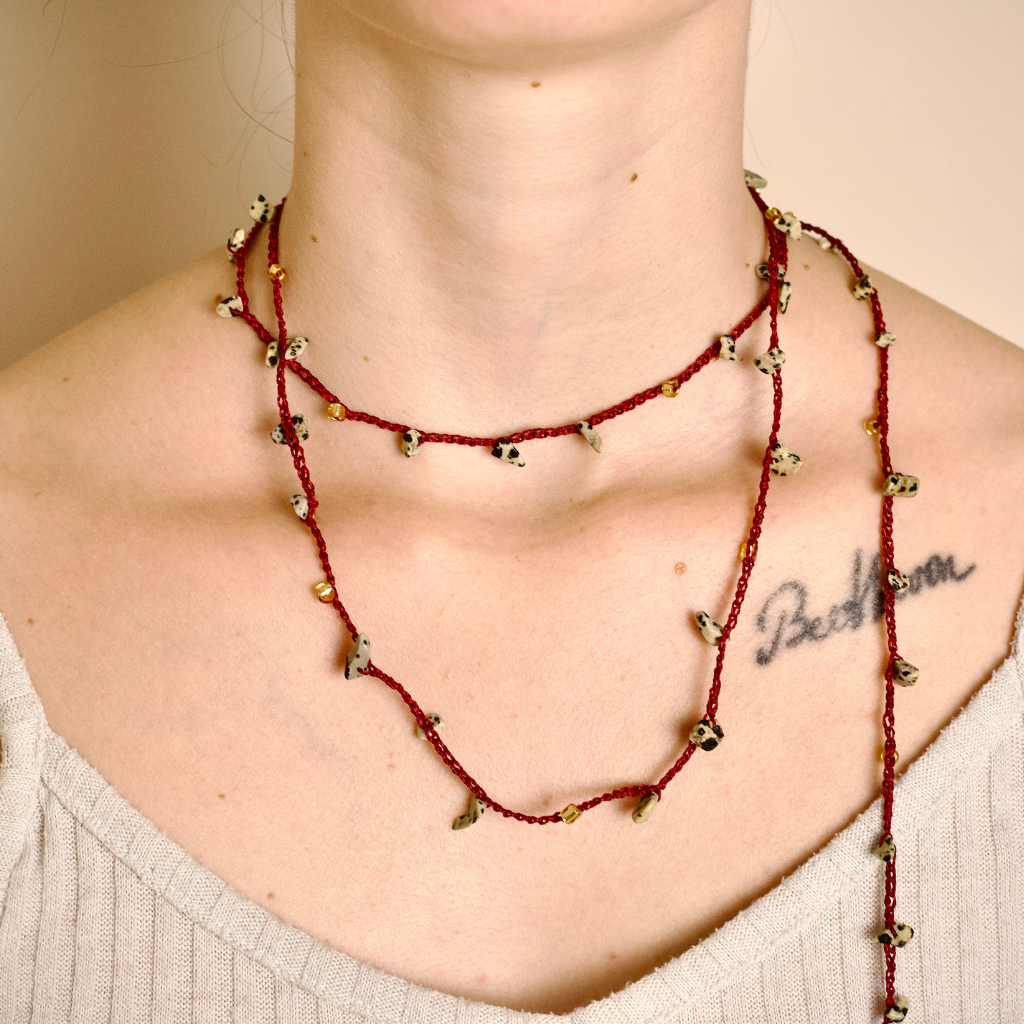 Tejido a mano con hilo resistente y decorado con cuentas metálicas doradas, está elaborado con jaspe dálmata, una piedra que combina fuerza, alegría y protección, ayudando a equilibrar tu energía mientras aporta un toque original a cualquier look.