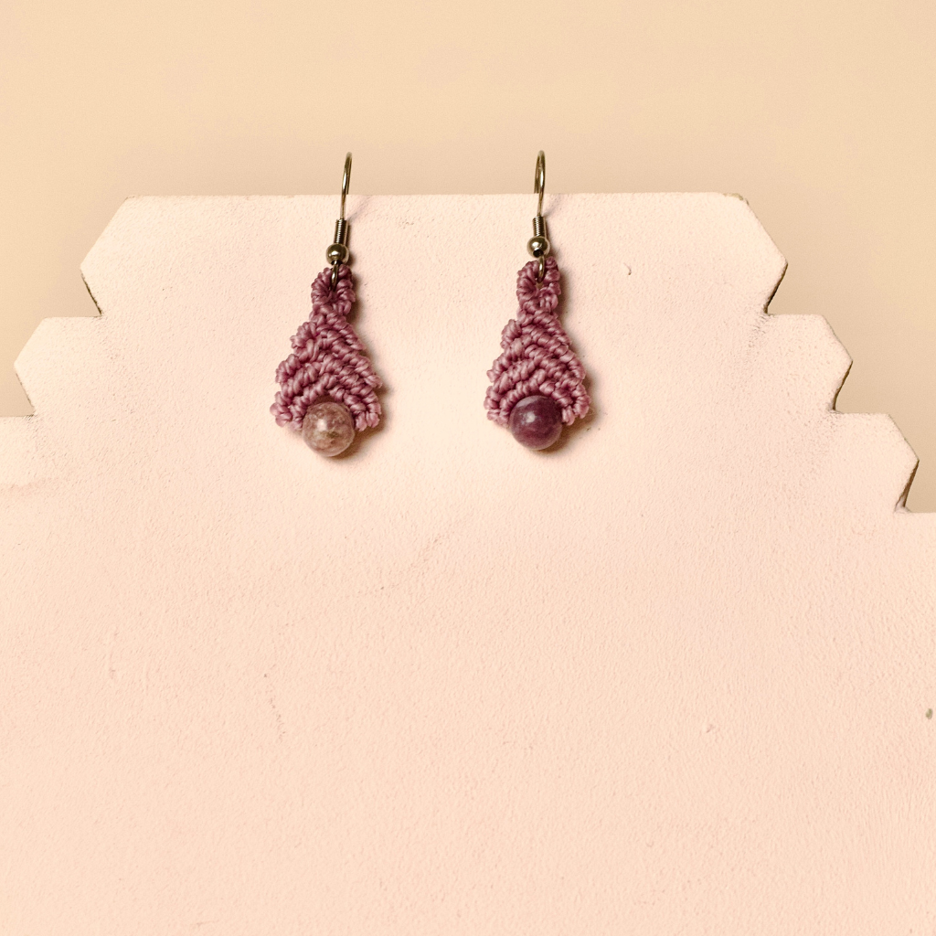 Estos pendientes artesanales están tejidos a mano en macramé y decorados con cuentas de lepidolita natural, una piedra asociada a la serenidad, la armonía emocional y la liberación del estrés. Su diseño ligero y cómodo los convierte en un accesorio ideal para el día a día, aportando un toque bohemio y lleno de intención.